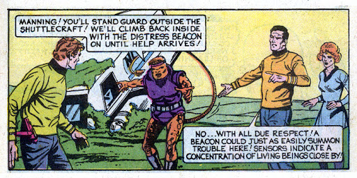 Spock learns of the shuttle’s crash. It’s been brought down on the nearby planet of Tristas. He’s been working alongside one of the locals who looks like Lex Luthor! Luthor, sorry T’Oell, relates the history of Tristas. It’s not good. They seemed to be scholars in constant search of knowledge and discovery, including the secrets of life. One day, Tristas stopped communicating, turning inward, and taking prisoner anyone who violates their territory