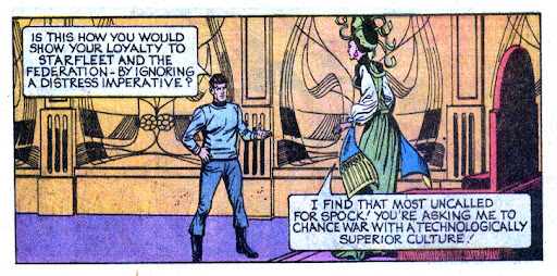 Spock discovers that Queen Arama is a Vulcan! She is the daughter of the last Vulcan ambassador but considers herself Quodarian. And she understands what is going on at Tristas. The pair logically debates over what to do and that night a shuttle piloted by Spock takes off for Tristas.