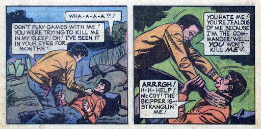 Before McCoy can cause anyone lots of grief, Kirk decks him and that seems to shake the doctor’s mind back into place. As they settle in for the night, it seems something has had an effect on Kirk as well. He attacks Scotty, convinced the engineer is getting ready to kill him. McCoy hits him with a narco-pellet (?) and renders the captain unconscious. When Kirk awakens he is fine again.