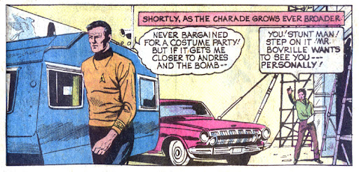 Kirk, back in 1955, leaps aboard Andres’ chariot intent on disarming the bomb. And it’s all getting shot on film for the movie! As Kirk and Andres fight and converse, Andres realizes that Njam has betrayed him and killed Lax, all for money. Andres was trying to keep the bomb away from Njam, who used it all as a blackmail opportunity. The bomb is recovered, and Kirk saves the day (and maybe the film?).