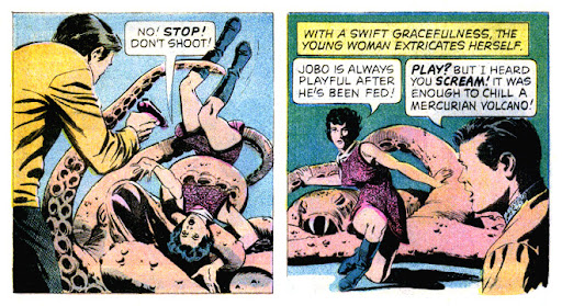 While McCoy goes to seek directions around the university, Kirk gets caught up with an incident at extraterrestrial animal research. He thinks a young woman is being attacked by a strange creature, but it’s just a bit of play and feeding.