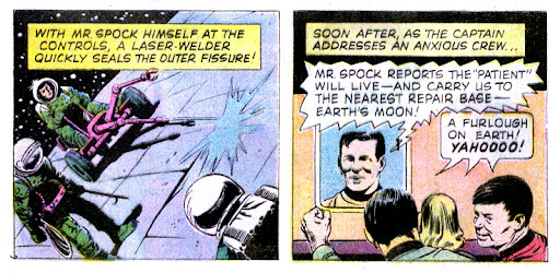 The splash page shows the Enterprise about to whether a giant cosmic storm, though an aside at the top of the page lets us know they’ll survive and get some much-needed R&R. The storm causes a number of effects on the ship and her crew, battering her around. Just another day boldly going.