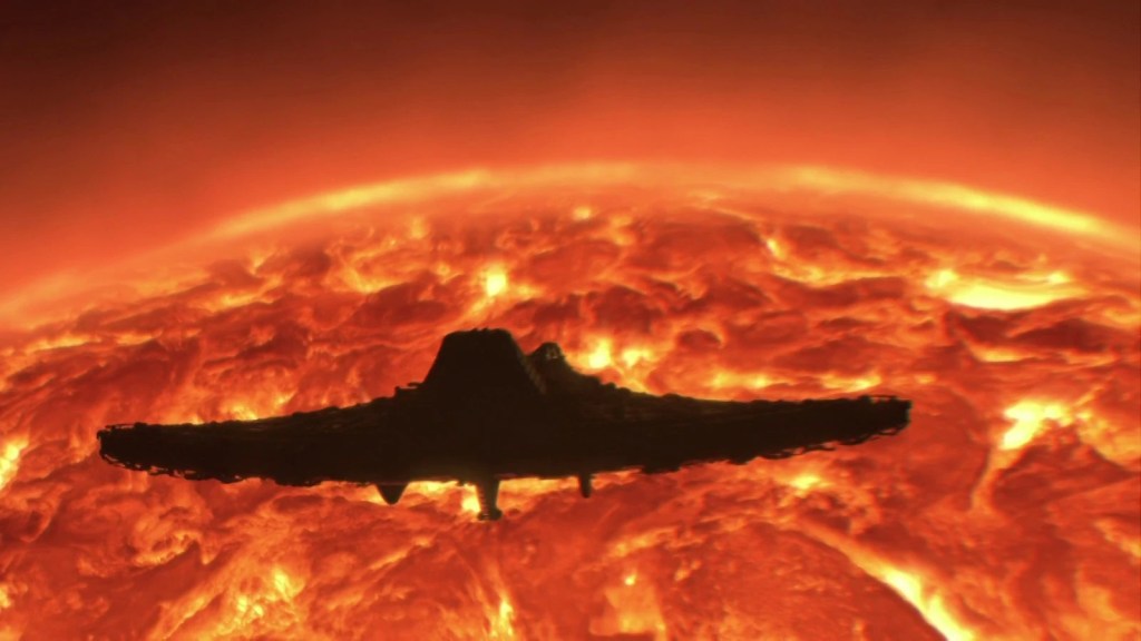 As the Destiny draws closer to the star, and people are preparing for their end, something begins to happen aboard the ship. It doesn’t crash into the sun, it uses it, to recharge, power up, and resume its course, recovering the shuttle on the way.