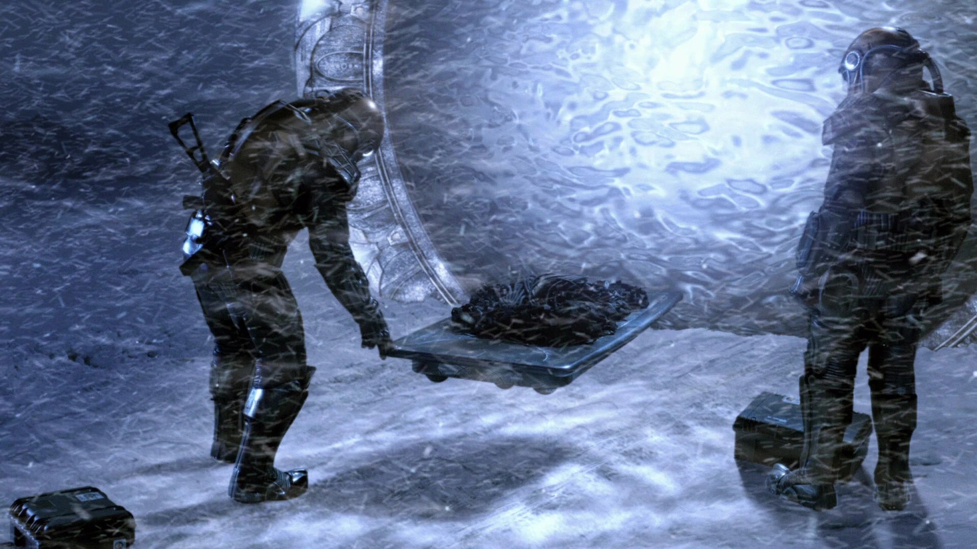 When Destiny drops out of FTL, a nearby planet with a toxic atmosphere is covered in ice. But only two of Destiny’s space suits are currently operational. So Scott and Young are off to carve some ice.